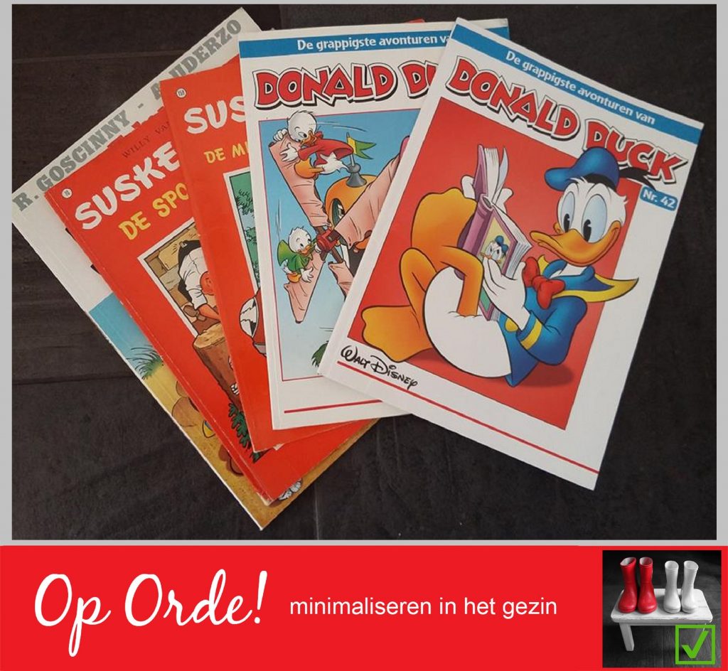 En als het gaat om de stripboeken, dan is dat uiteraard een prima klusje om samen met je kinderen te doen. Denk ook aan de Donald Duck-pockets, vakantiezomerboeken etc. Spreid wederom die hele verzameling uit op de eettafel. Welke willen ze écht heel graag houden? Van welke kunnen ze afstand doen? Misschien kunnen ze er een vriendje of vriendinnetje blij mee maken.